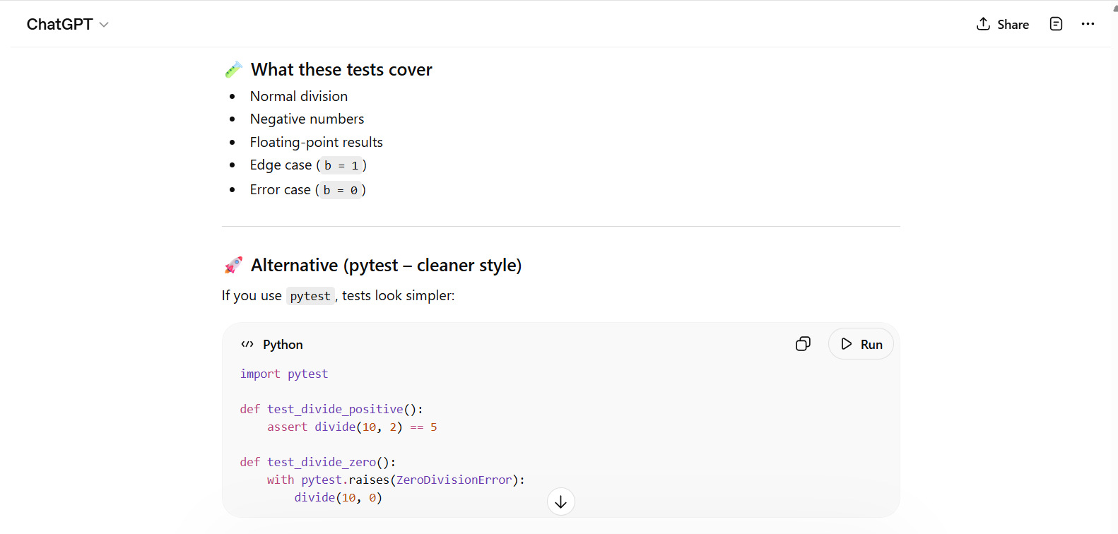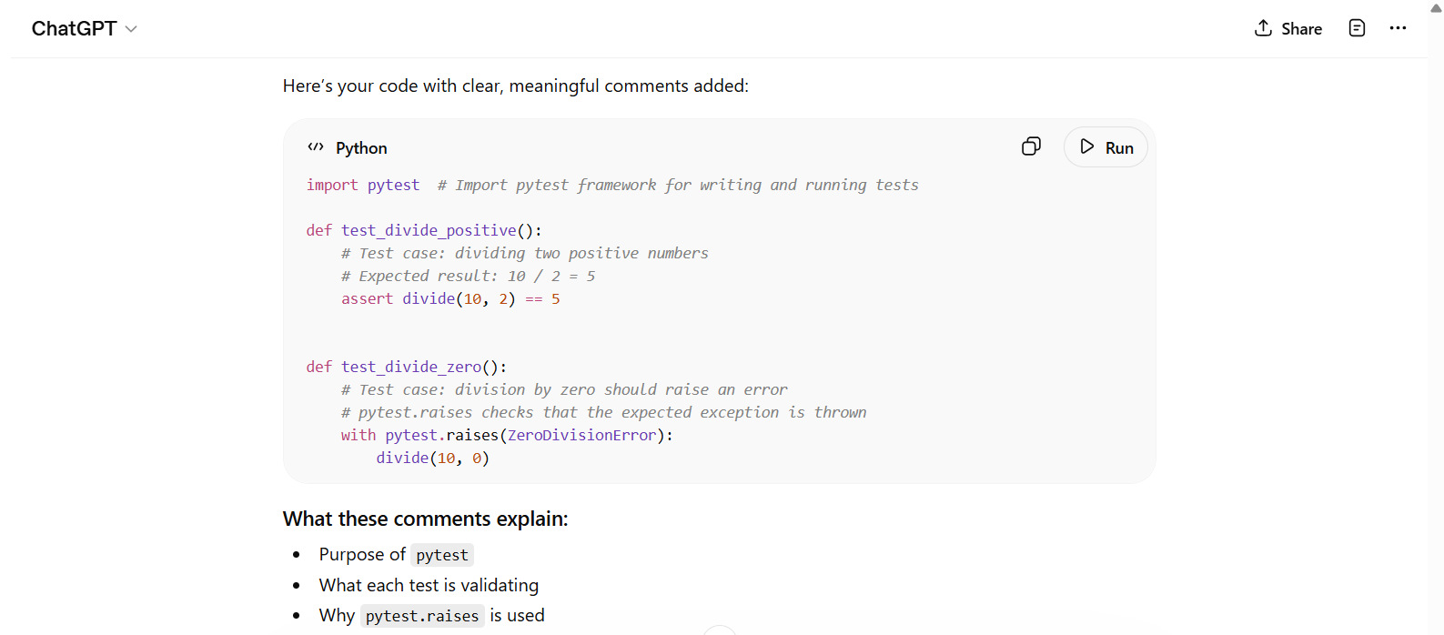 ChatGPT can also generate testing and documentation materials through prompts. You can also generate comments using appropriate prompts. The following prompts show examples of generating unit tests, comments, and documentation.