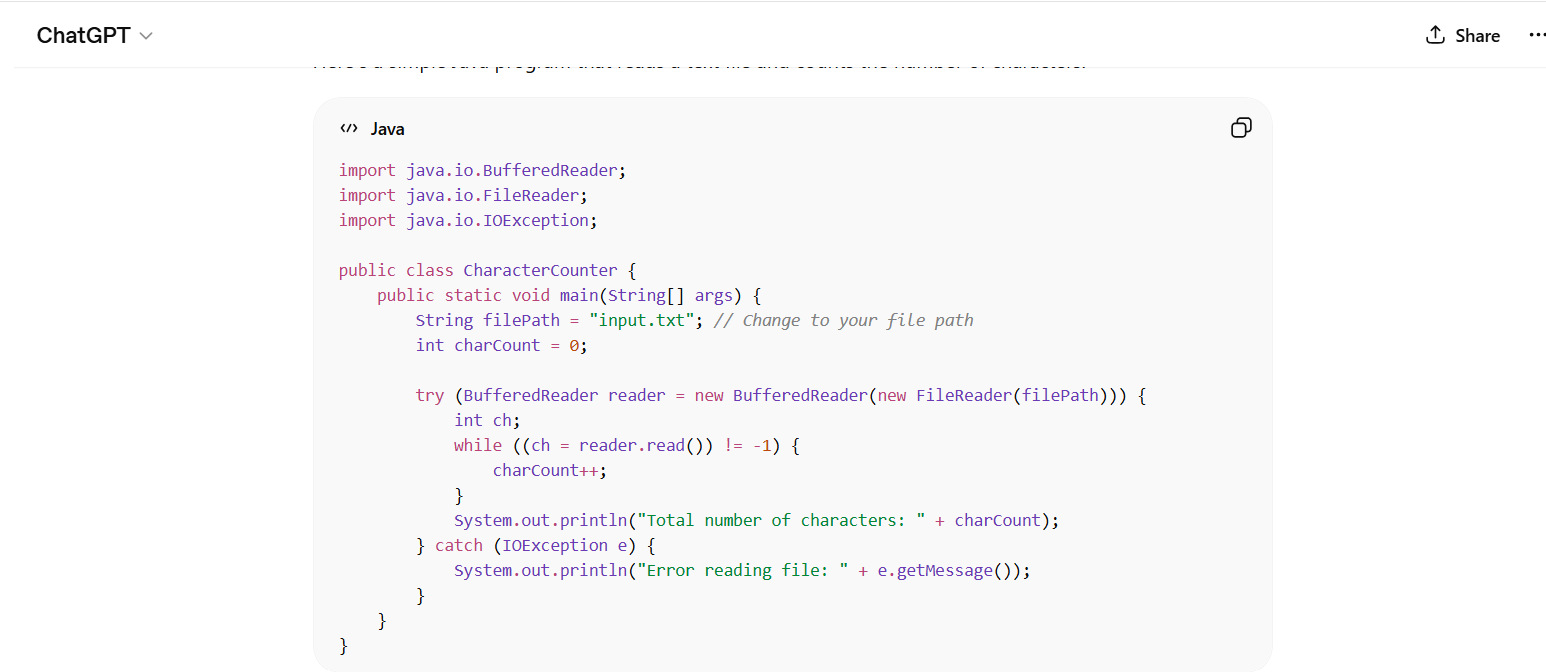 Create a Java program that reads a text file and counts the number of characters