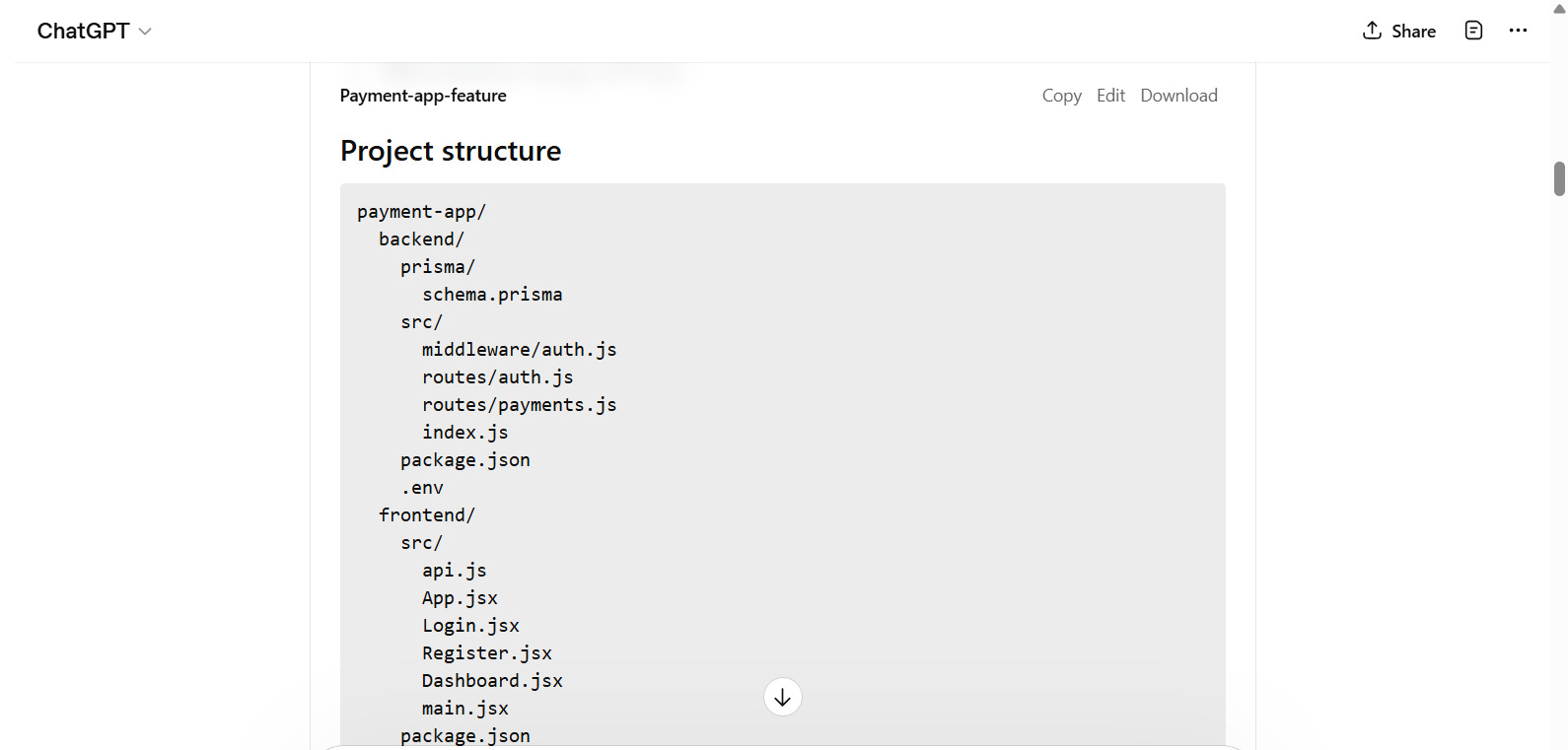 ChatGPT generates a detailed project structure and generates code files (backend and frontend) for each function of the payment system. In addition, it also generates “run” instructions, feature descriptions, and next updates. A project structure generated is shown here: