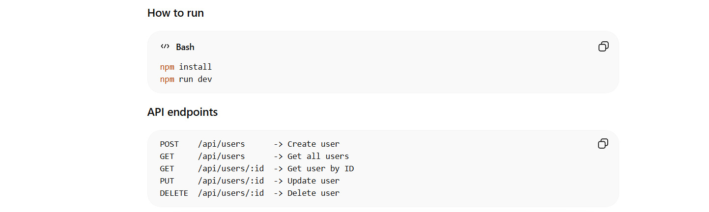 The output generated for the above system design prompt includes a detailed design of the system, including its modules, structure, tech stack, database schema, and API endpoints (for CRUD operations), along with code files. An example implementation, install & run procedure, design notes, improvements, and summary are also included in the output. A partial output is shown here: