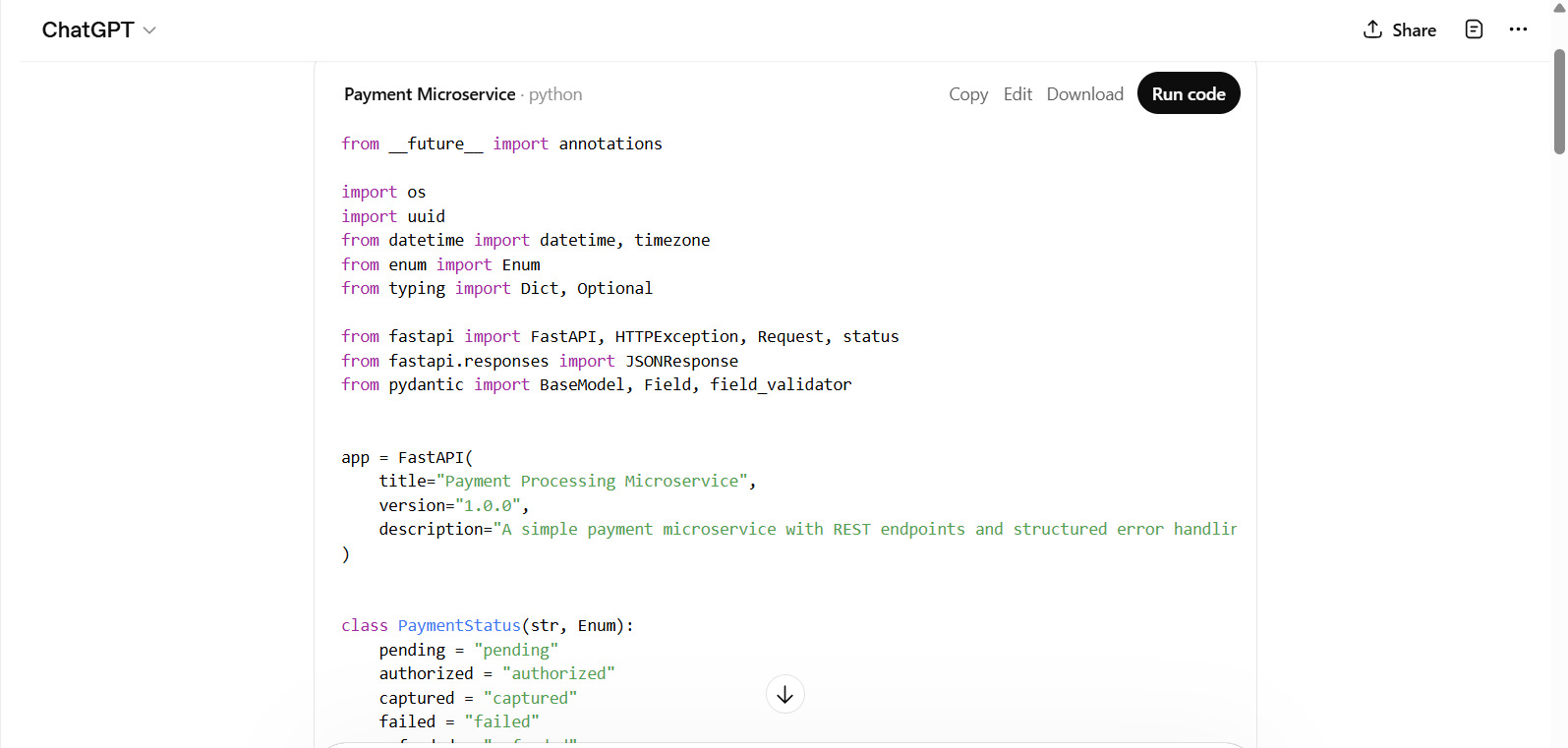 The prompt generates a ready-to-use microservice code along with execution instructions and feature details.