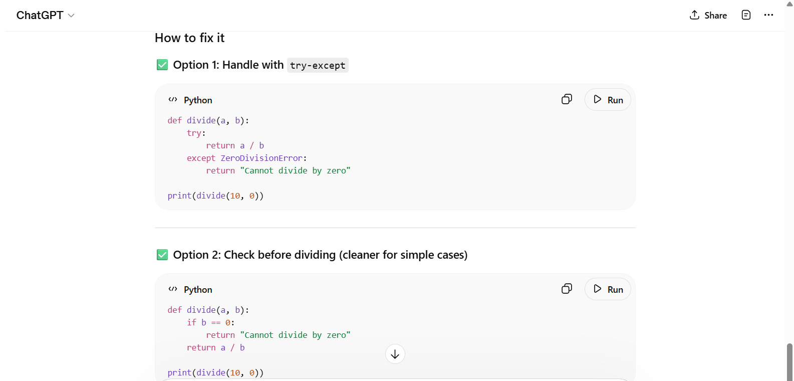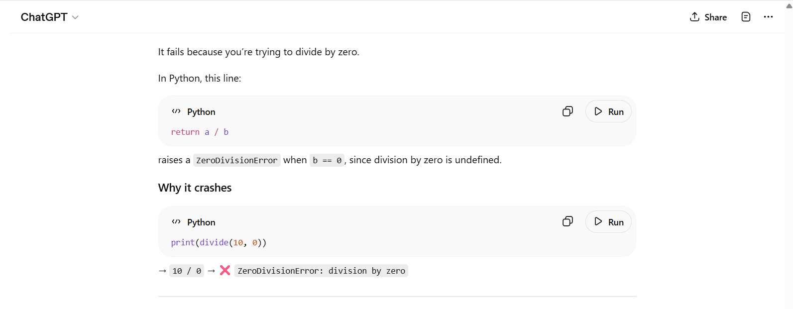 Given this code: def divide(a, b): return a / b print(divide(10, 0)) Why does it fail, and how can it be fixed?