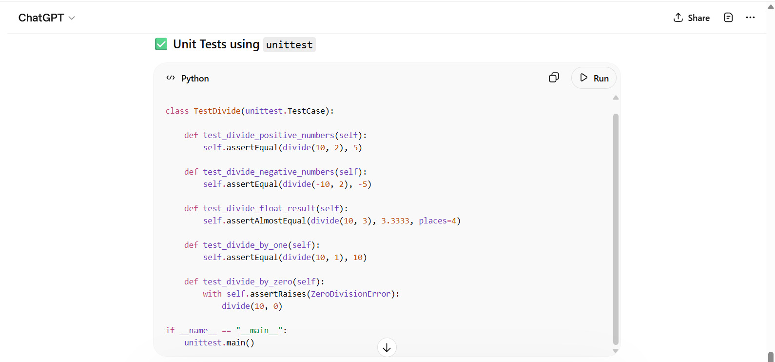 Given this code: def divide(a, b): return a / b print(divide(10, 3)) Write unit tests for this function.