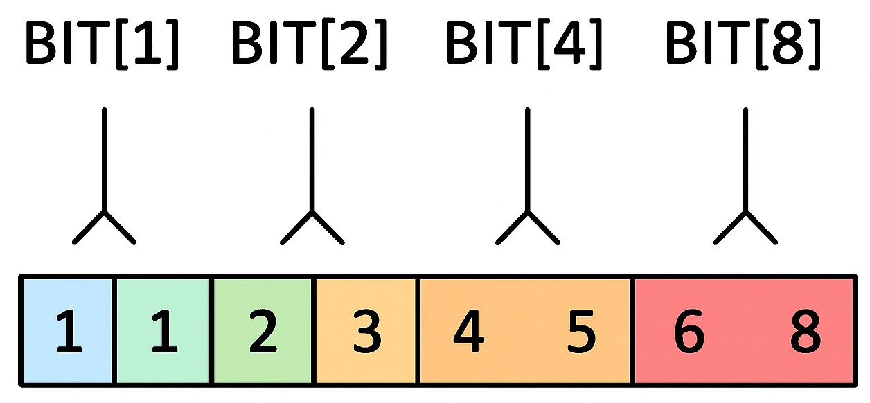 • BIT[i] represents a block of size i & -i, where & is the bitwise AND.