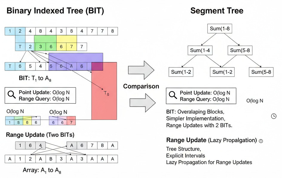One of the most potent and basic concepts in data structures is the tree. They aid effective searching, updating, and querying processes by helping us organize data hierarchically. The Fenwick Tree (also called the Binary Indexed Tree) and Segment Tree are two instances of specialized structures within the general category of trees that are made for range queries and cumulative computations. We will explore these structures, understand their underlying principles, and examine their relative efficiency.