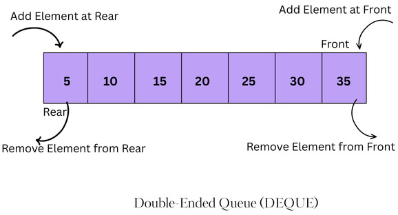 - Linear Structure: Elements in a deque are arranged sequentially, so it is a linear structure.