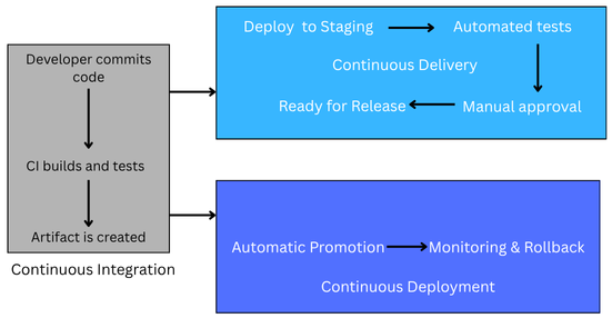 | Automation Scope | Builds and tests automation | Builds, tests, and automates staging deployment | Automates full pipeline, including production deployment |