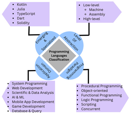 There are hundreds of programming languages currently available on the market, making it difficult to track them all. Hence, these programming languages must be classified to facilitate easy identification. While there are dozens of ways to classify programming languages, three main categories are commonly used: level of abstraction, programming paradigms, and application domain. The fourth classification provides emerging languages. The detailed classification is shown here: