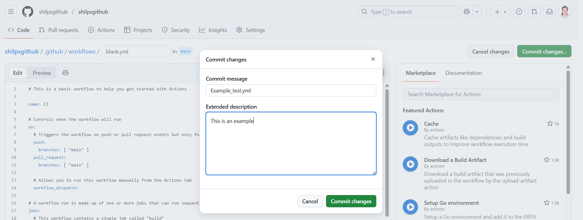 • Copy and paste the following sample YAML code. Save the file as example.yml and push your local code into the GitHub repository.