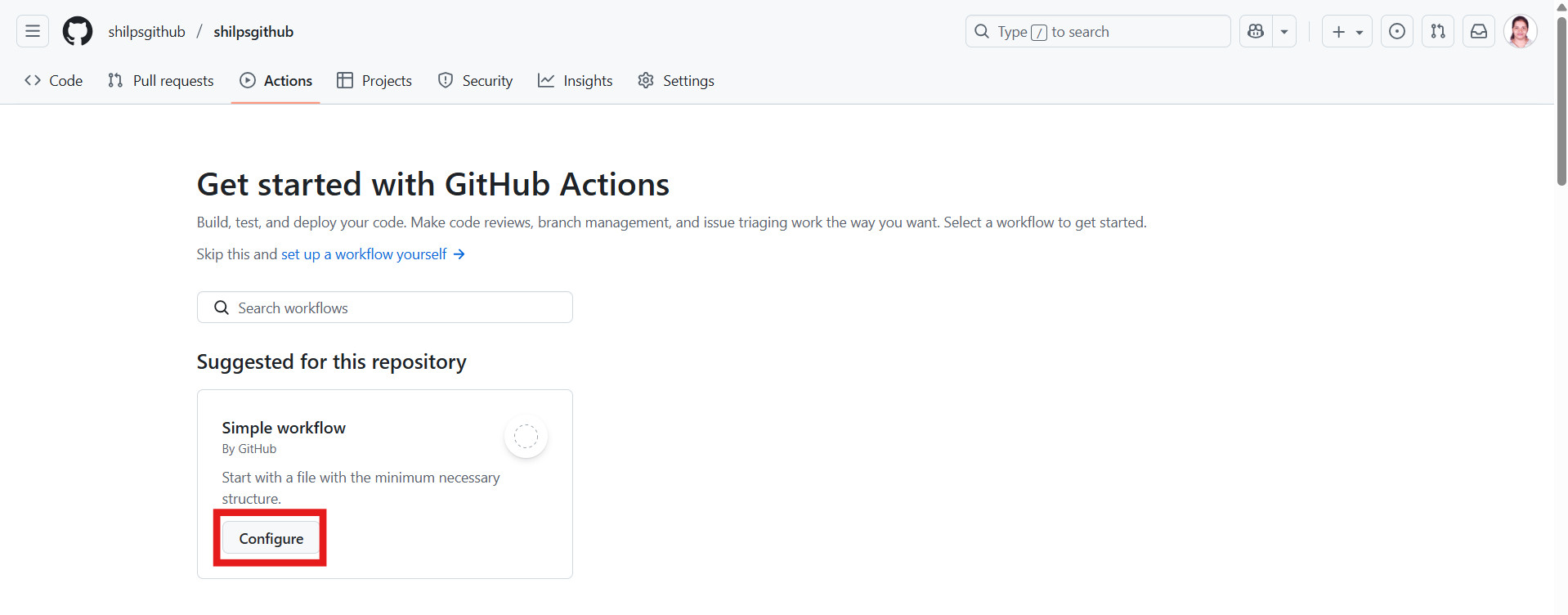 GitHub automatically provides suggestions according to the nature of your project. Select the GitHub workflow and click the Configure button to create your action.
