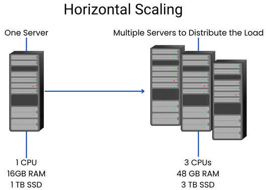 • Horizontal Scaling (Scaling Out): In horizontal scaling, more servers are added to the system to distribute the increased workload. By distributing the workload across multiple servers, horizontal scaling prevents a single point of failure and improves overall reliability.