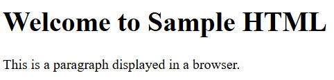 <!DOCTYPE html> <html> <head> <title>HTML Sample</title> </head> <body> <h1>Welcome to Sample HTML</h1> <p>This is a paragraph displayed in a browser.</p> </body> </html>