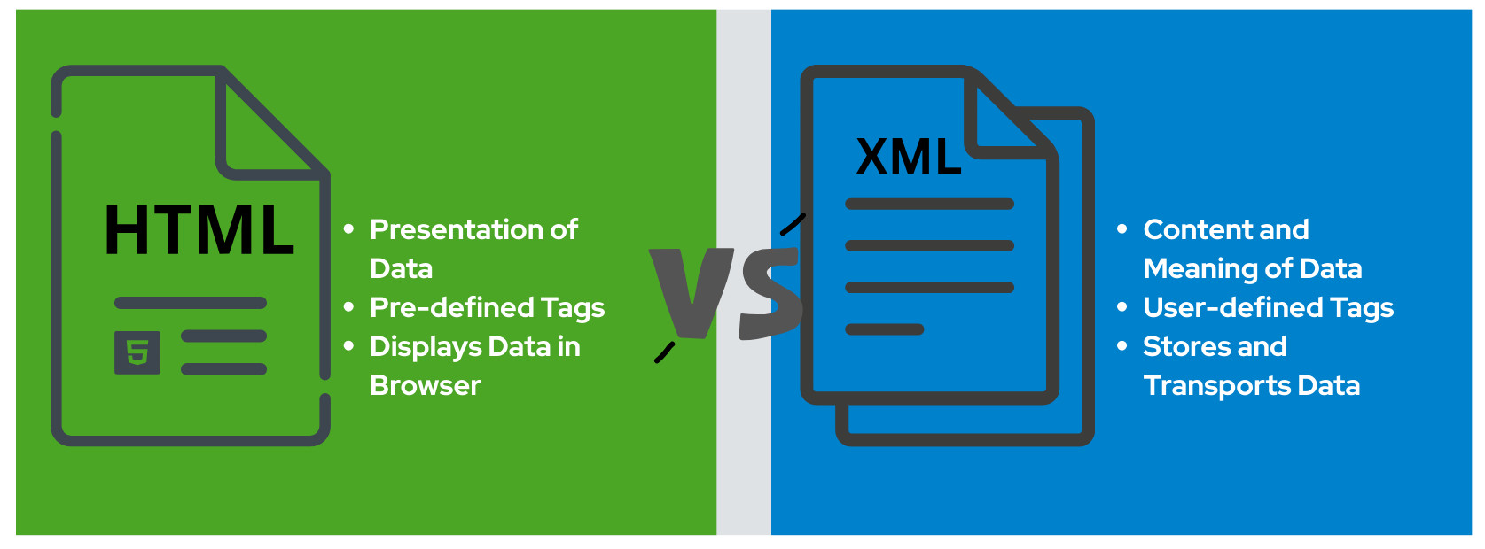 | Definition | A markup language used primarily for displaying structured content in a browser. | A markup language used primarily for exchanging structured data between computer systems. |