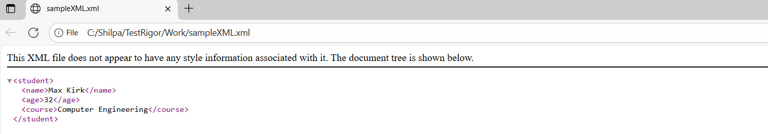 <?xml version="1.0" encoding="UTF-8"?> <student> <name>Max Kirk</name> <age>32</age> <course>Computer Engineering</course> </student>