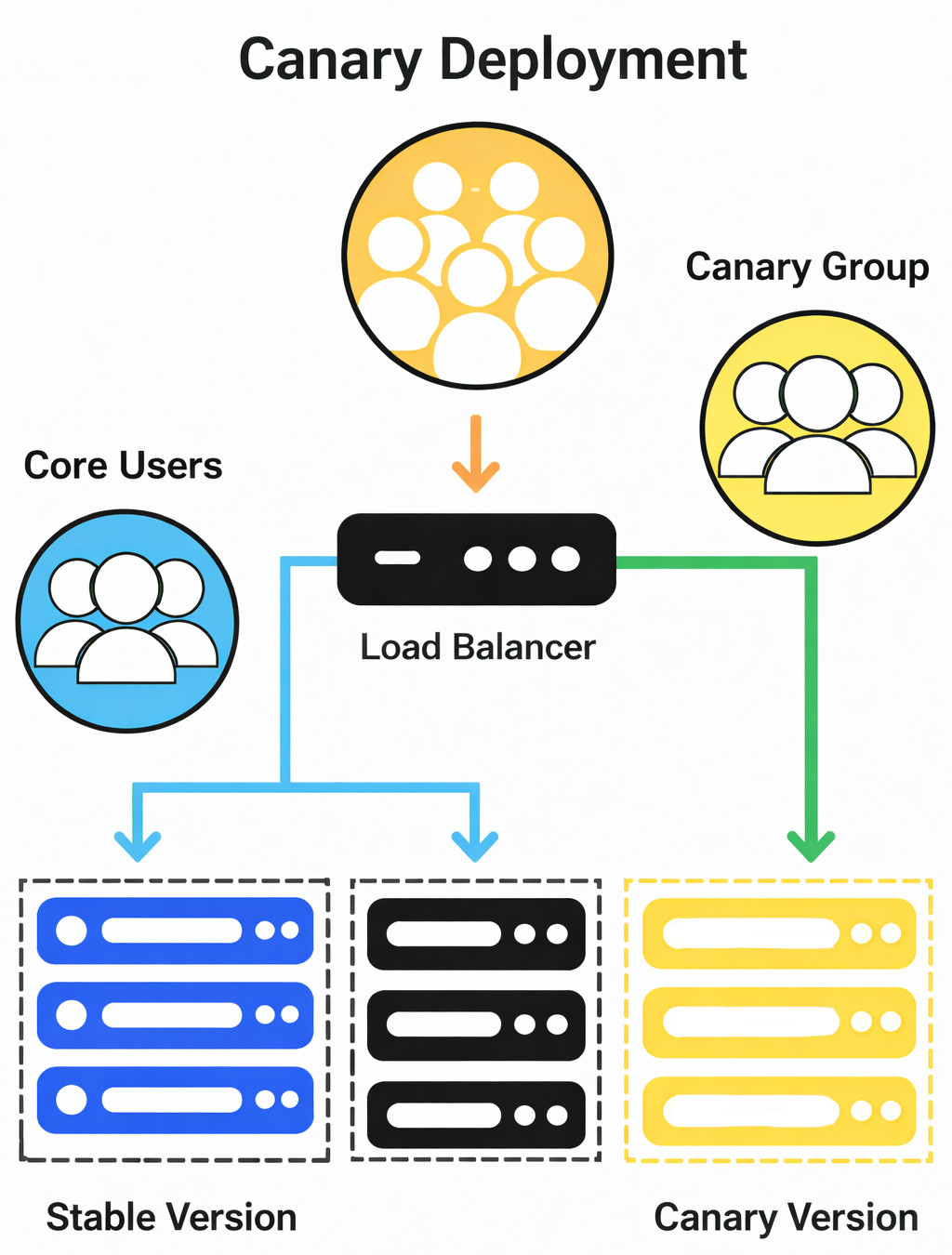 A canary deployment, which draws motivation from the “canary in the coal mine” analogy, releases software to a restricted number of users before gradually reaching the entire population. This method reduces the potential exposure while helping organizations to validate new features under actual traffic. Canary deployments are critical for organizations such as Facebook, Google, and Netflix to maintain stability while releasing updates regularly.