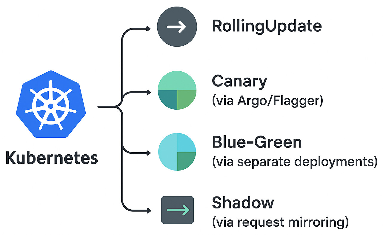 Shadow Deployment in KubernetesKubernetes can mimic actual user requests and route them to a shadow version of an application by using traffic mirroring. This keeps users protected from possible bugs while verifying error handling, API behavior, and performance.In reality, teams often integrate these K8s deployment strategies depending on business needs and risk tolerance. For extra safety, a blue-green rollout might be followed by a canary deployment.