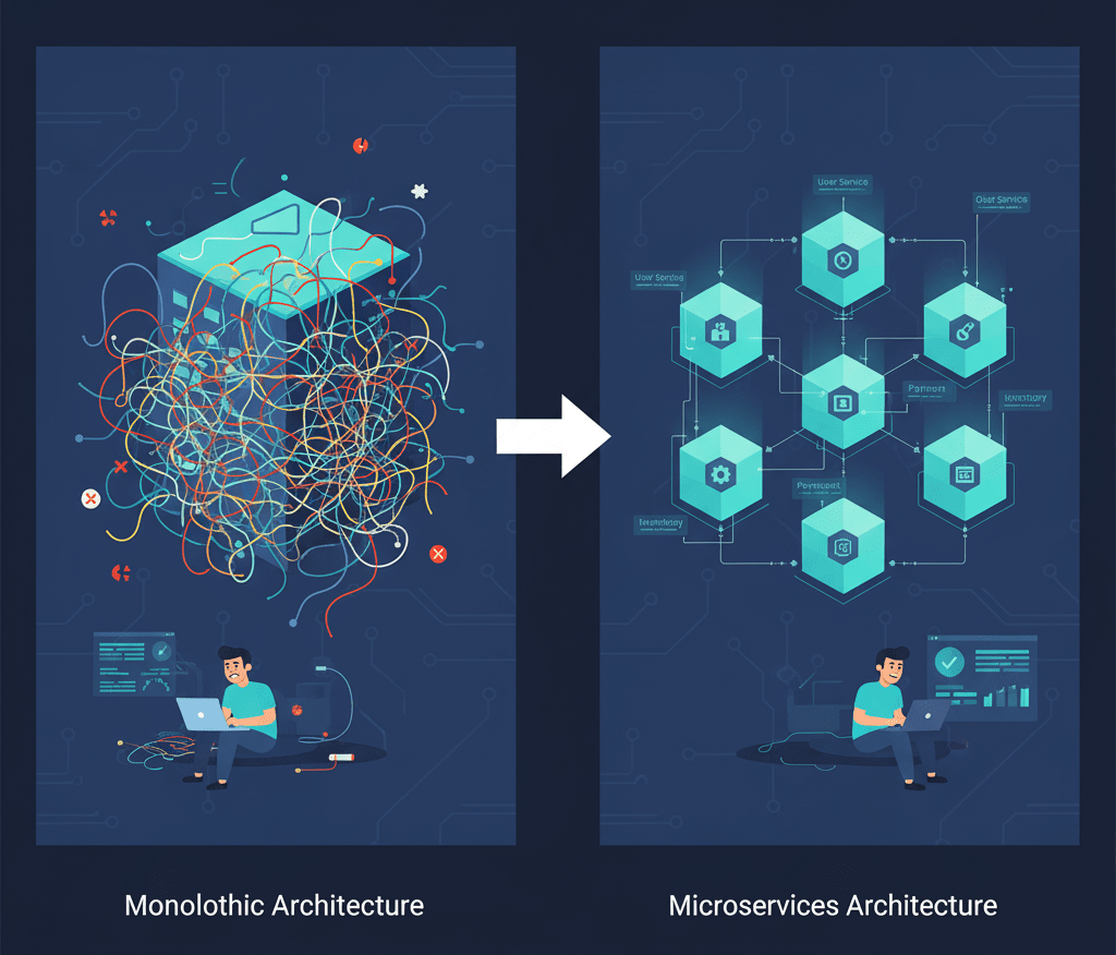 Answer: Monolithic architecture is one single large application that is tightly coupled and hard to scale or deploy independently. Microservices, on the other hand, are a collection of small, independent services that are loosely coupled and easier to scale and deploy.