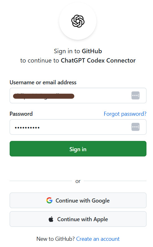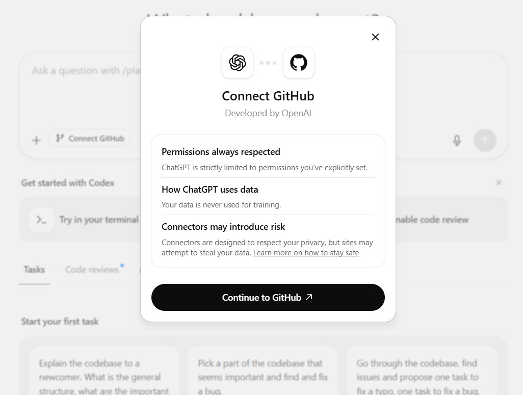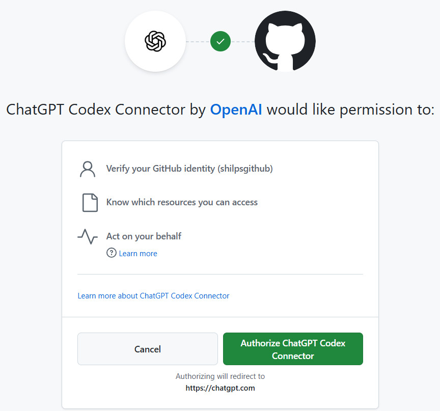As Codex operates directly on repositories, it needs permission to access our GitHub account. Click the “Connect to GitHub” button. The following window is shown.