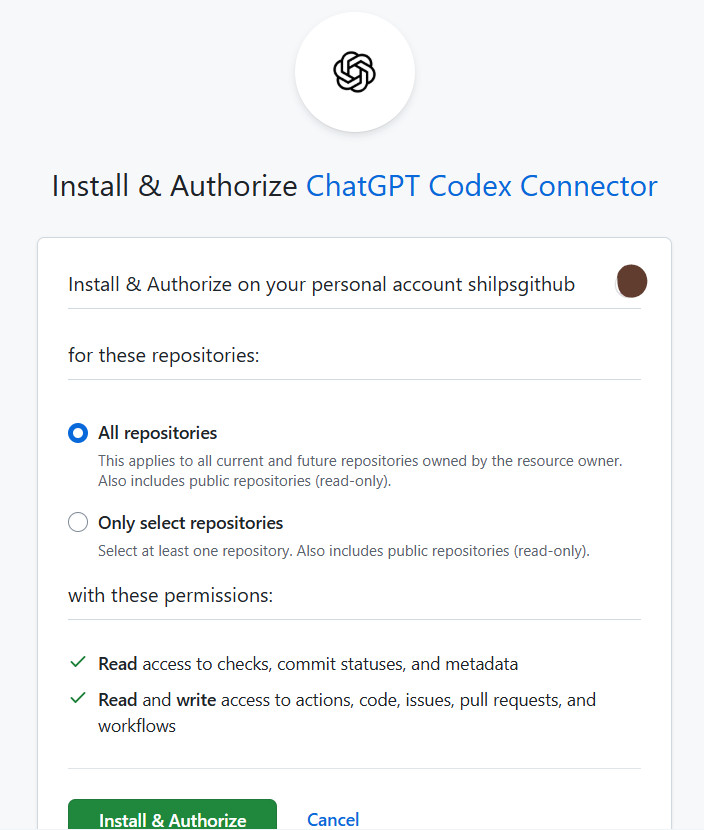 Clicking “Install & Authorize” allows Codex to view and interact with the repositories you have provided access to. In this case, since we selected “All repositories”, the Codex gets access to all the repositories as seen below: