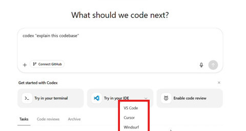 Using this option brings the Codex agent extension into your IDE, such as Visual Studio Code and its forks. Currently, Codex supports three IDEs: VSCode, Cursor, and WindSurf, shown in the screenshot below:
