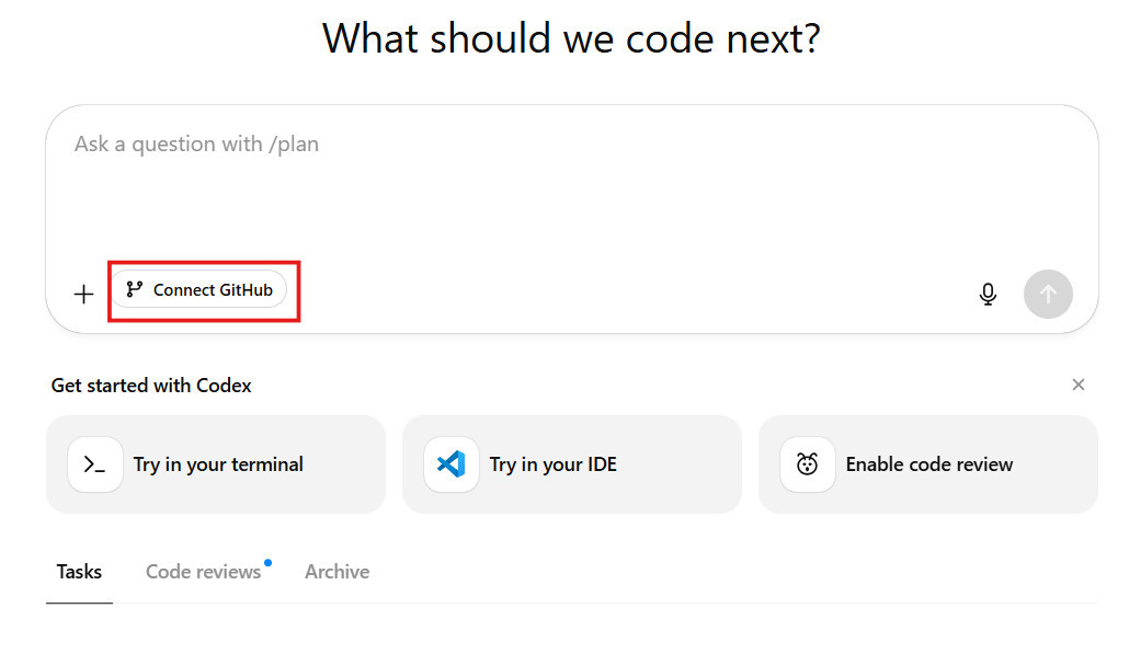 This is the location where all task executions, configurations, and code interactions will occur. The setup process begins by linking the Codex with your GitHub Account to access the codebase.