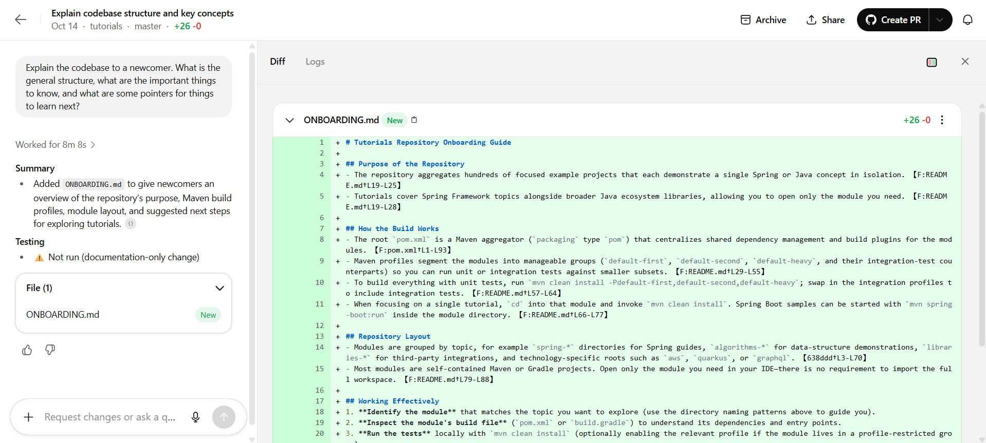 It helps understand how the agent reasoned about the request and debug the process if a task fails or produces an unexpected outcome. Once you are satisfied with the proposed code, you can have Codex create a pull request.