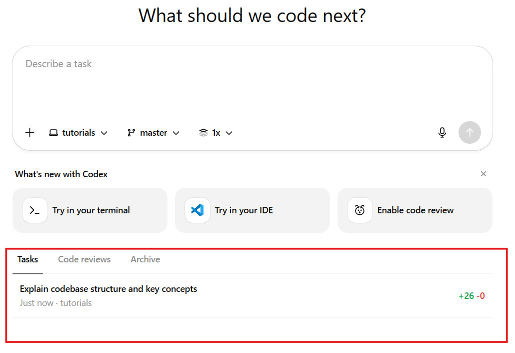 The way you interact with Codex is fundamentally different from using a real-time AI assistant. Codex operates on an asynchronous delegation model, freeing developers from waiting on tasks. It enables multitasking as developers can perform other tasks while the Codex performs a task. A typical task in Codex can take anywhere from 1 to 30 minutes, depending on its complexity.