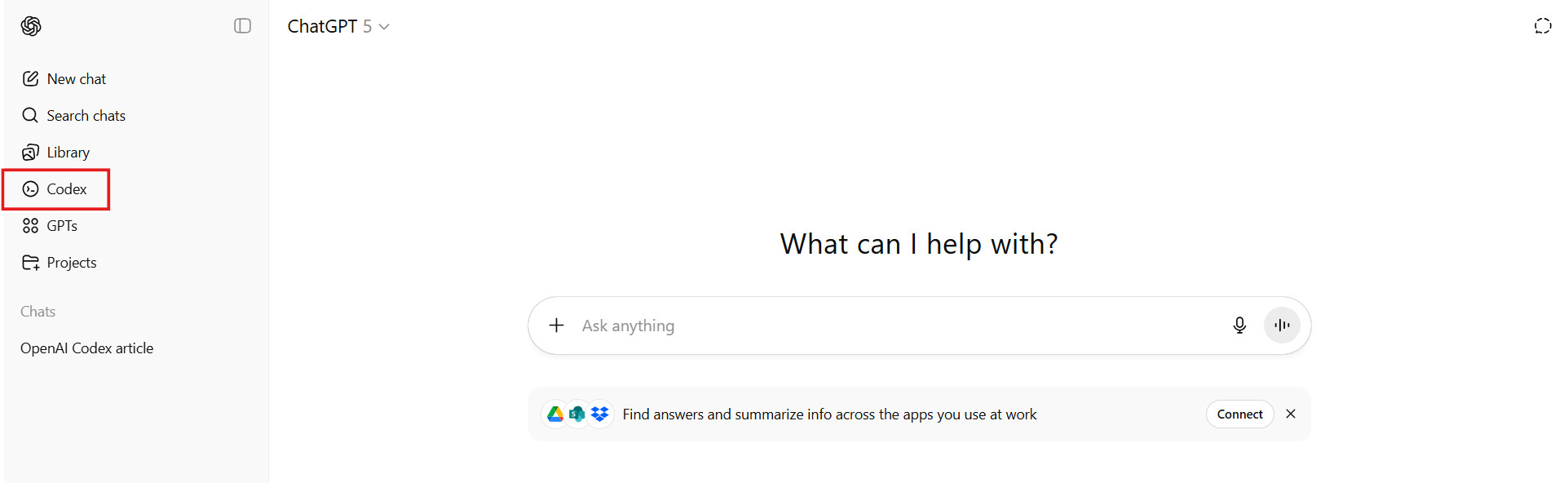 Step 1: Locate the Codex tool in the ChatGPT interface