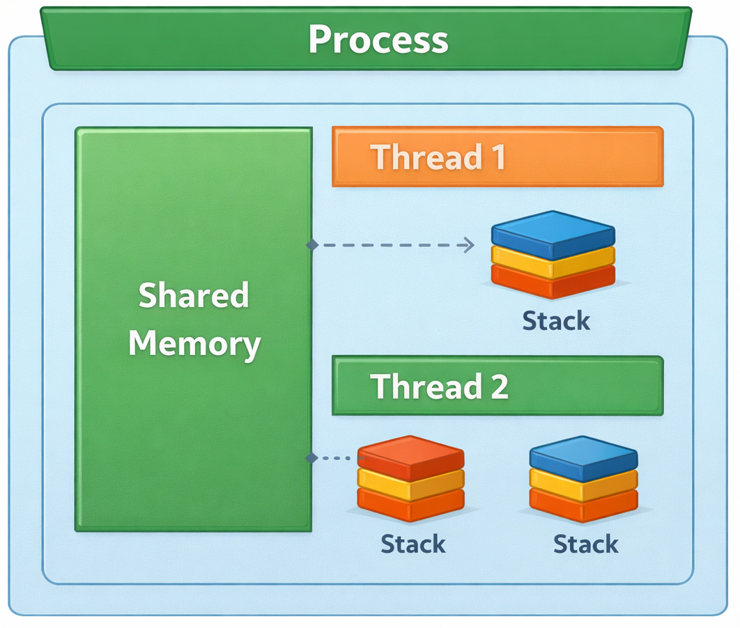 A single program might be split into pieces that run separately. Processes handle isolation. Meanwhile, threads manage shared work inside one space. One keeps things apart, while the other links parts together tightly.