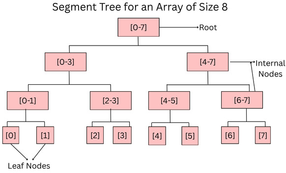 • Internal Nodes: Non-leaf nodes represent segments (ranges) of elements from the array. Each internal node stores aggregated information (e.g., sum, min, max) about the elements within its corresponding segment, derived from its child nodes.