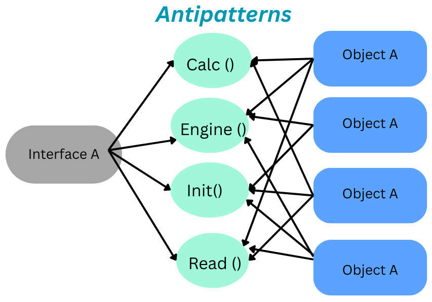 For example, in object-oriented programming (OOP), the software is separated into small pieces called objects. An anti-pattern in object-oriented programming is a God object, which performs many functions that would be better separated into different objects. This is evident in the following code: