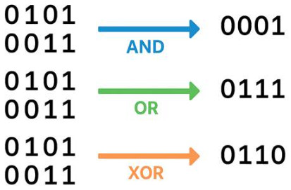 a = 5 # binary: 0101 b = 3 # binary: 0011 print(a & b) # AND -> 0001 = 1 print(a | b) # OR -> 0111 = 7