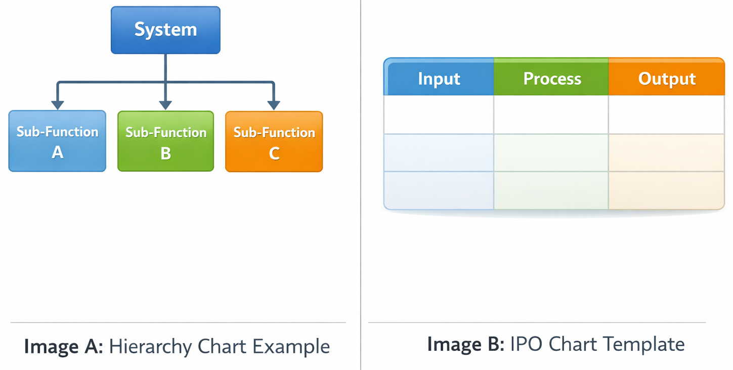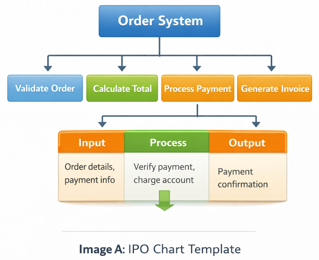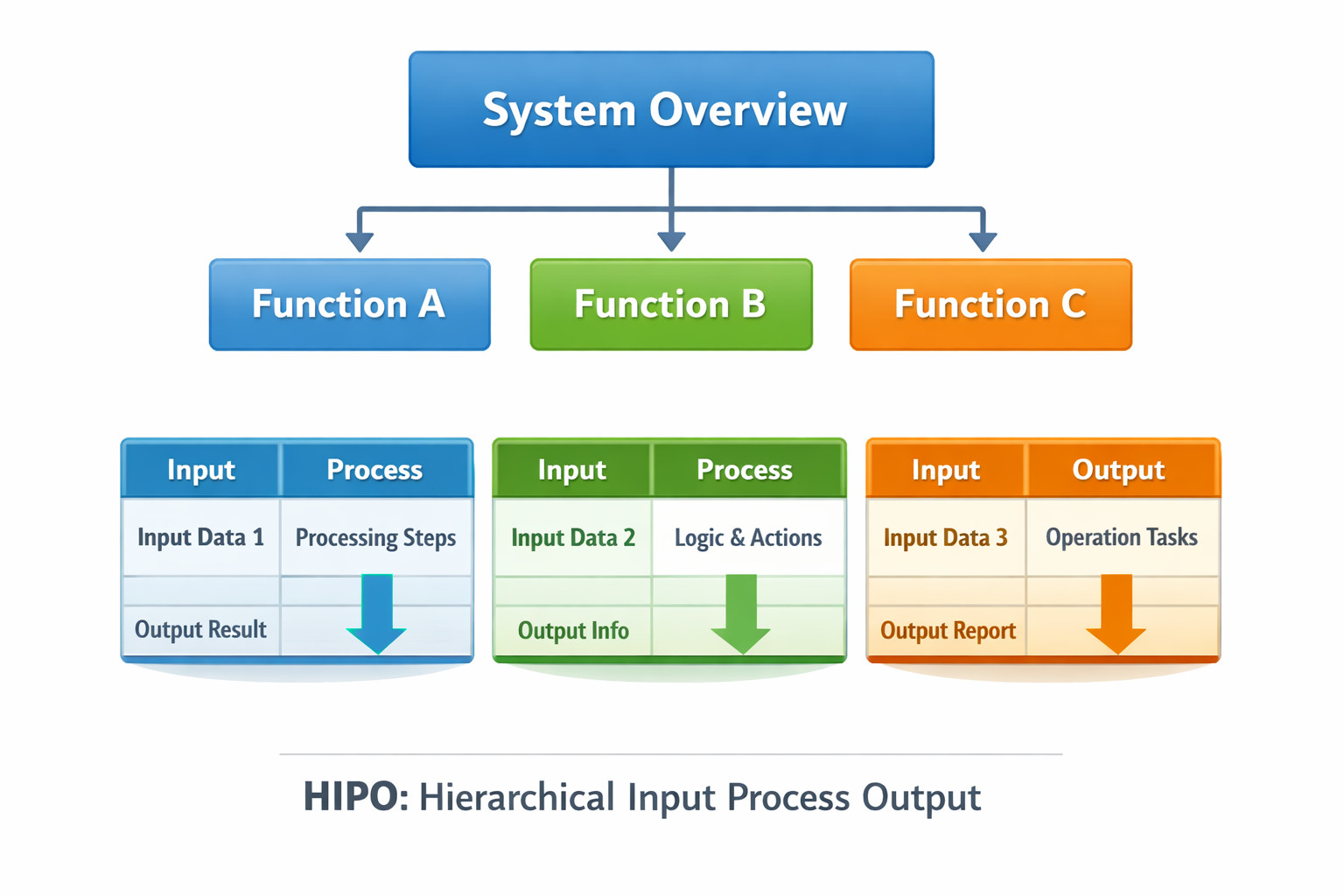 An IPO chart defines a single function by listing its input, process, and output. A HIPO diagram goes one step further by organizing multiple IPO charts into a hierarchy. In simple terms, IPO explains one function; HIPO explains how many functions fit together.