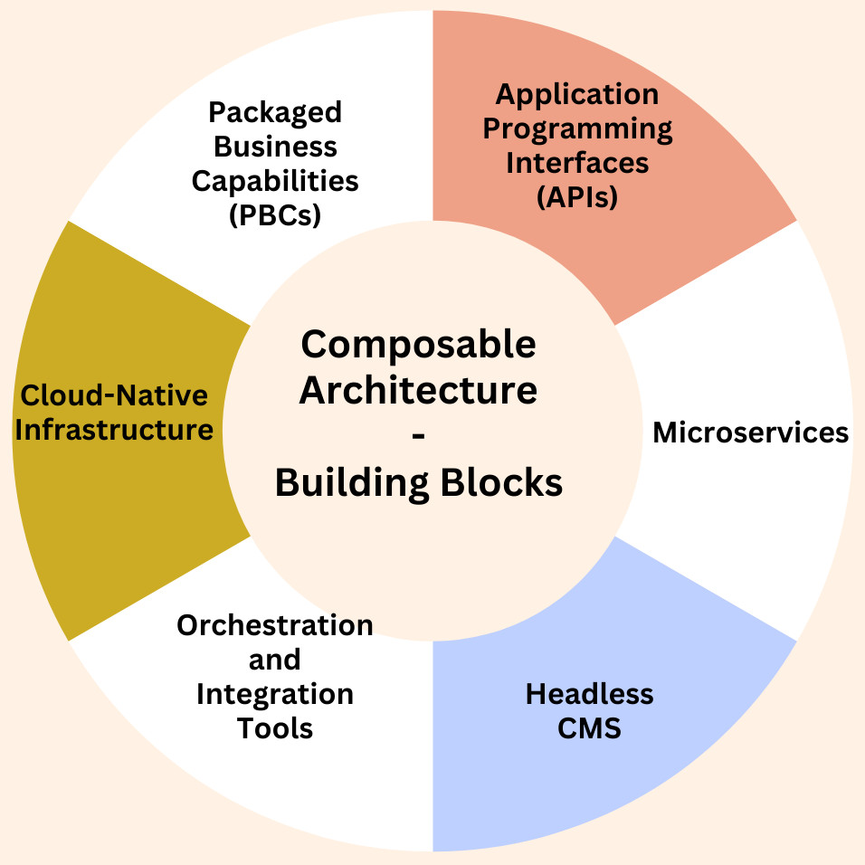Composable architecture is built on the following fundamental components based on the MACH approach. MACH stands for Microservices, API-first (application programming interfaces), Cloud Native, and Headless.