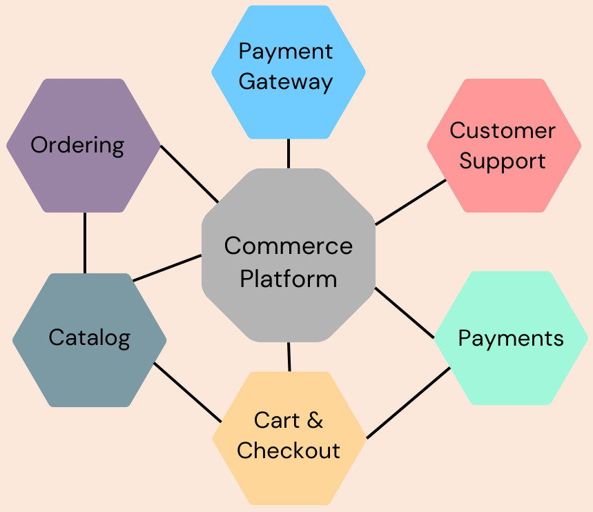 A commerce system using a composable architecture (with few connections) is represented as follows: