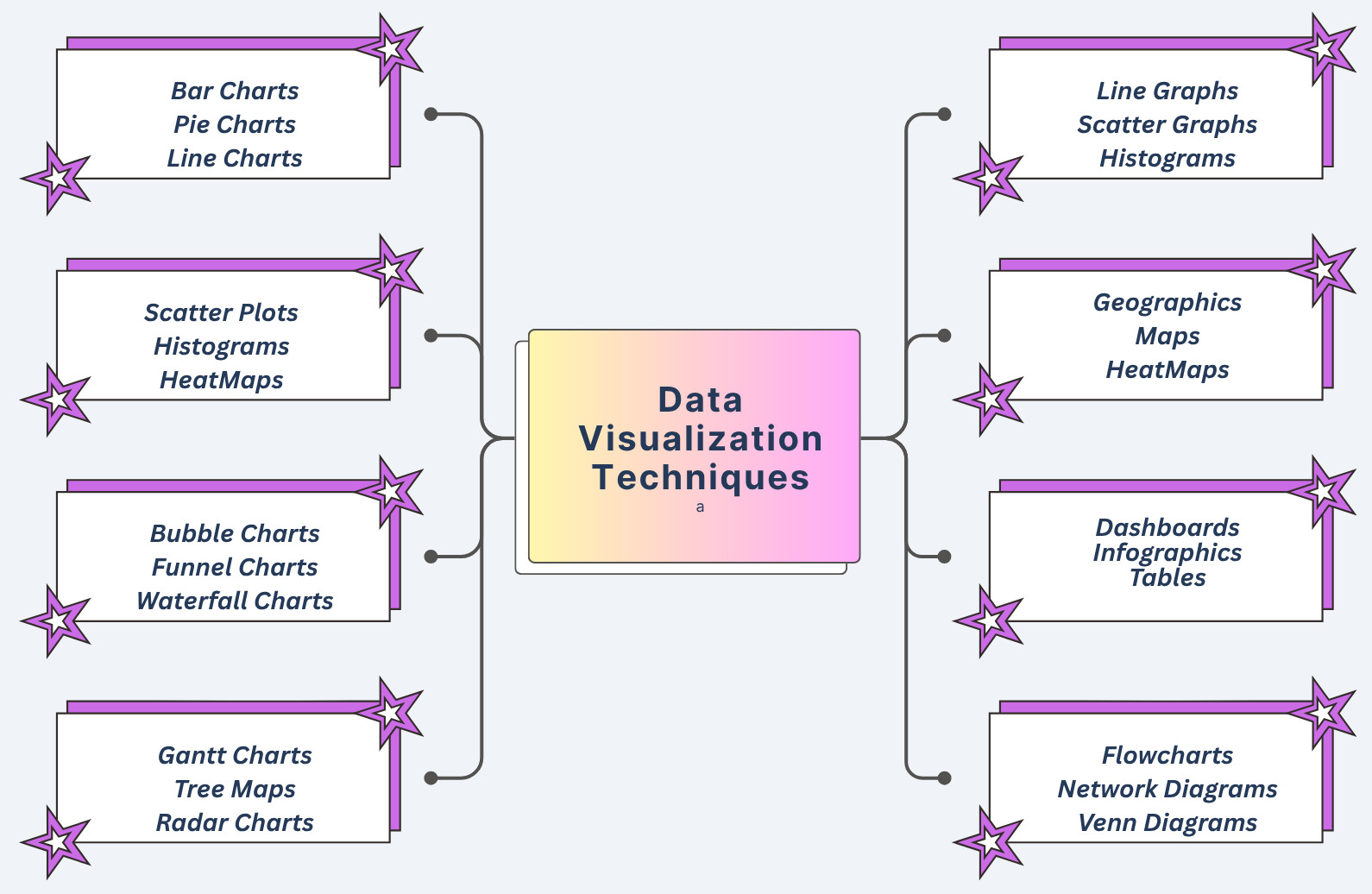 Data visualization consists of a vast array of techniques used to represent data visually. Common types include charts (bar, pie, and line charts), graphs (scatter plots and histograms), maps (heatmaps), and dashboards. Some tools also support an infographic that combines visuals and text.