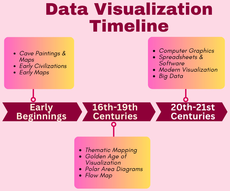 - Modern Visualization: The 21st century witnessed the rise of interactive dashboards, web-based visualization tools, and the growing importance of data literacy.