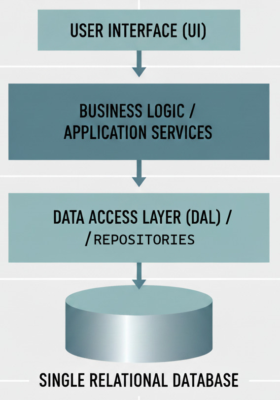 • Monolithic architecture bundles all application layers (UI, business logic, data access) into one deployable unit, with a shared database and in-process communication.