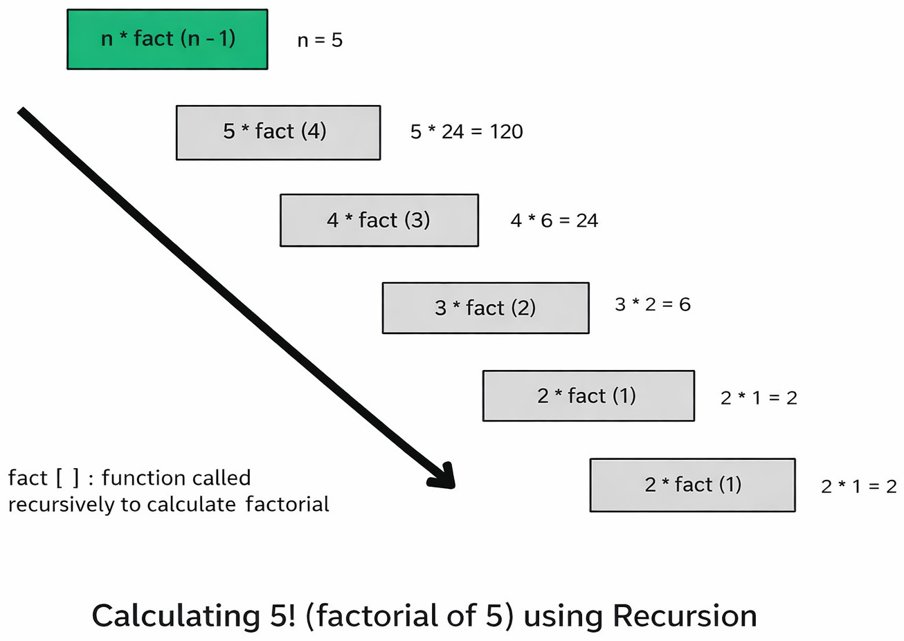 Instead, we use a function that basically implements the general procedure of calculating the factorial, but we call this function every time with a different argument. This is where recursion comes into the picture.