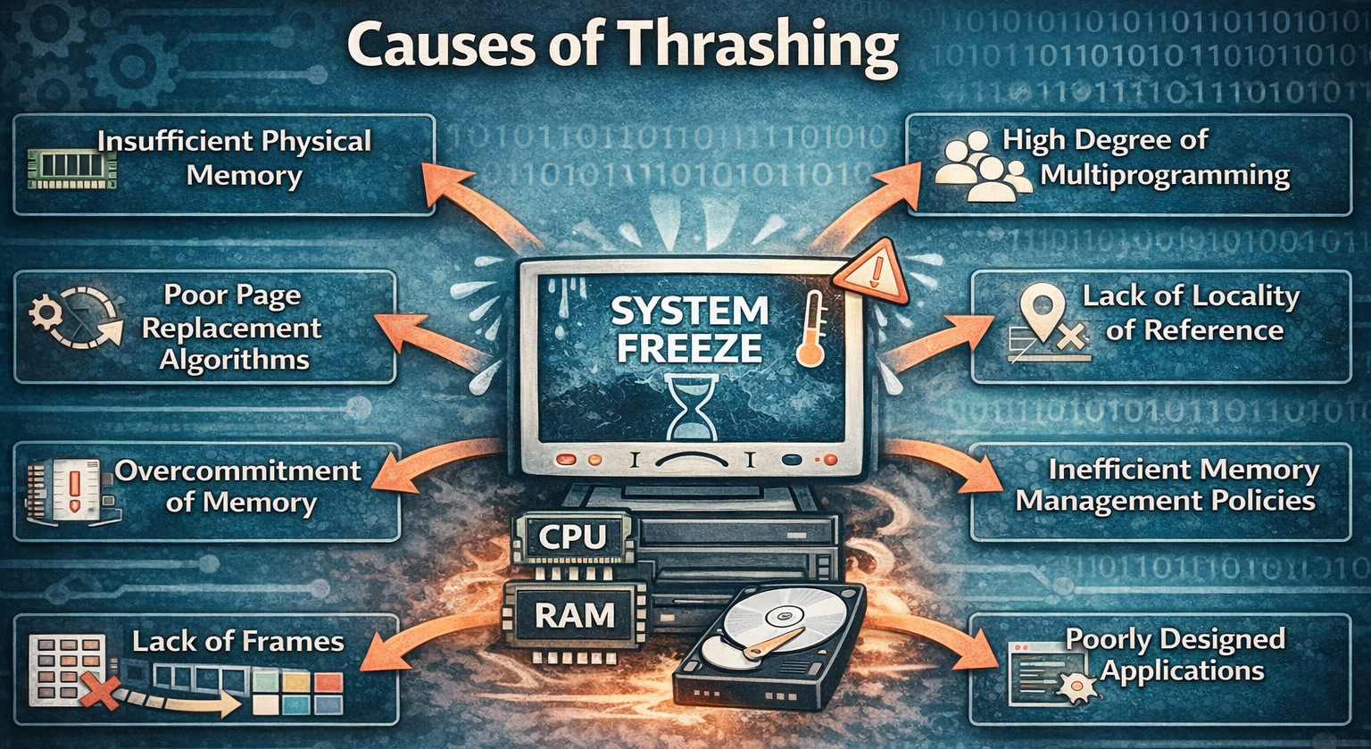 Thrashing is a critical situation in the OS that significantly degrades the system’s performance. It occurs when memory resources are overutilized, leading to excessive paging. Insufficient memory, high multiprogramming, and inefficient memory management techniques are the primary causes of thrashing.