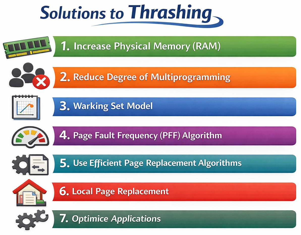 - Lack of Locality of Reference: Processes usually access limited memory locations repeatedly. If the system does not maintain this locality, it may load unnecessary pages, thus increasing the memory pressure. This ultimately leads to thrashing.